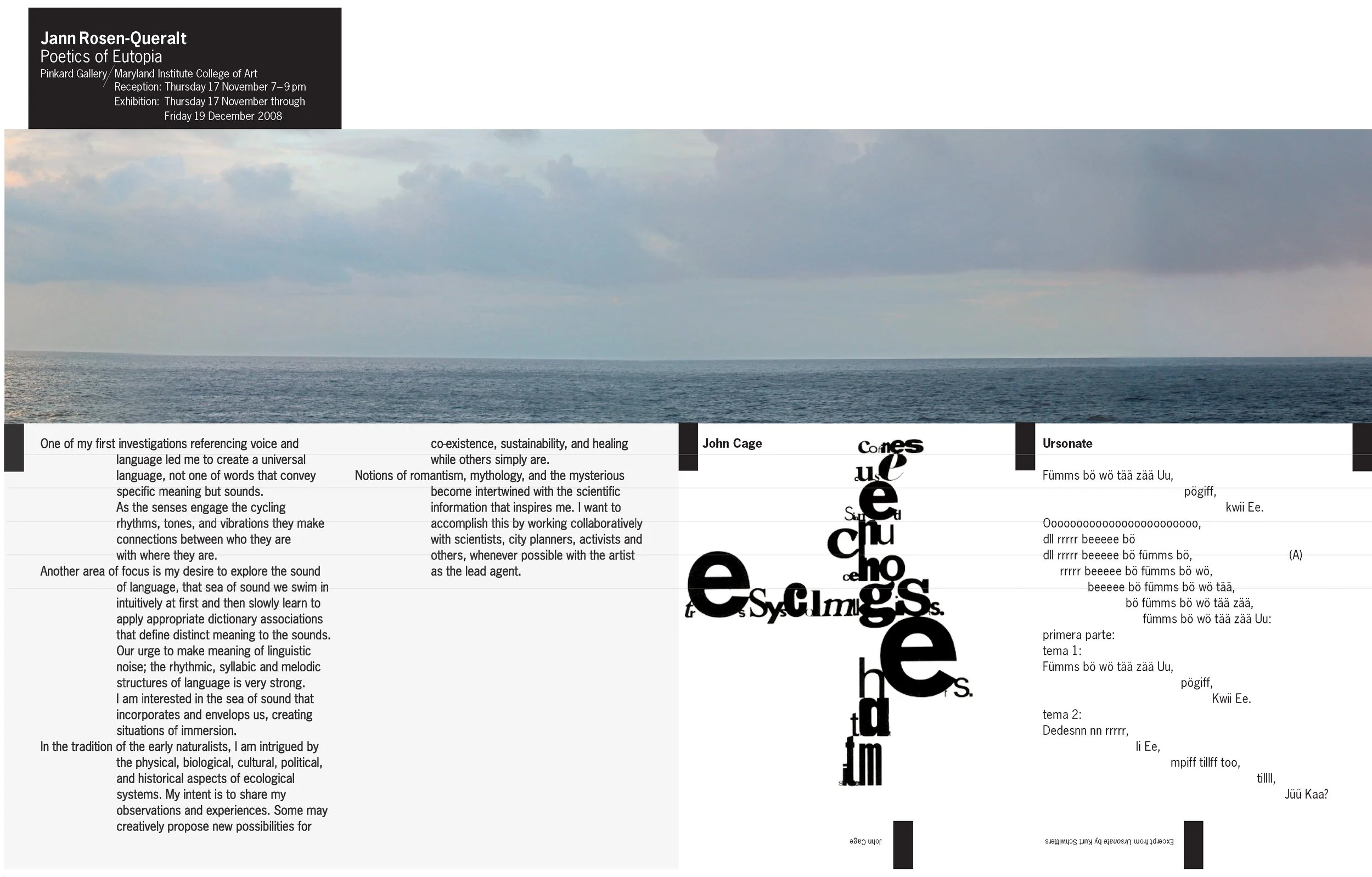 This installation explores ideas of meeting, connection, and the sublime wonder of nature. A Eutopia is a perfect but real place, as opposed to utopia, an imagined one. Through sound compositions, panoramic landscape photographs, and an intensive gallery guide focused on mapping the locations I visited to make the photographs and sound recordings, Poetics of Eutopia explores what defines a sense of place and community, and how it can be recorded and shared through multifaceted means. The work was installed in the Pinkard Gallery at Maryland Institute College of Art in Baltimore, Maryland.