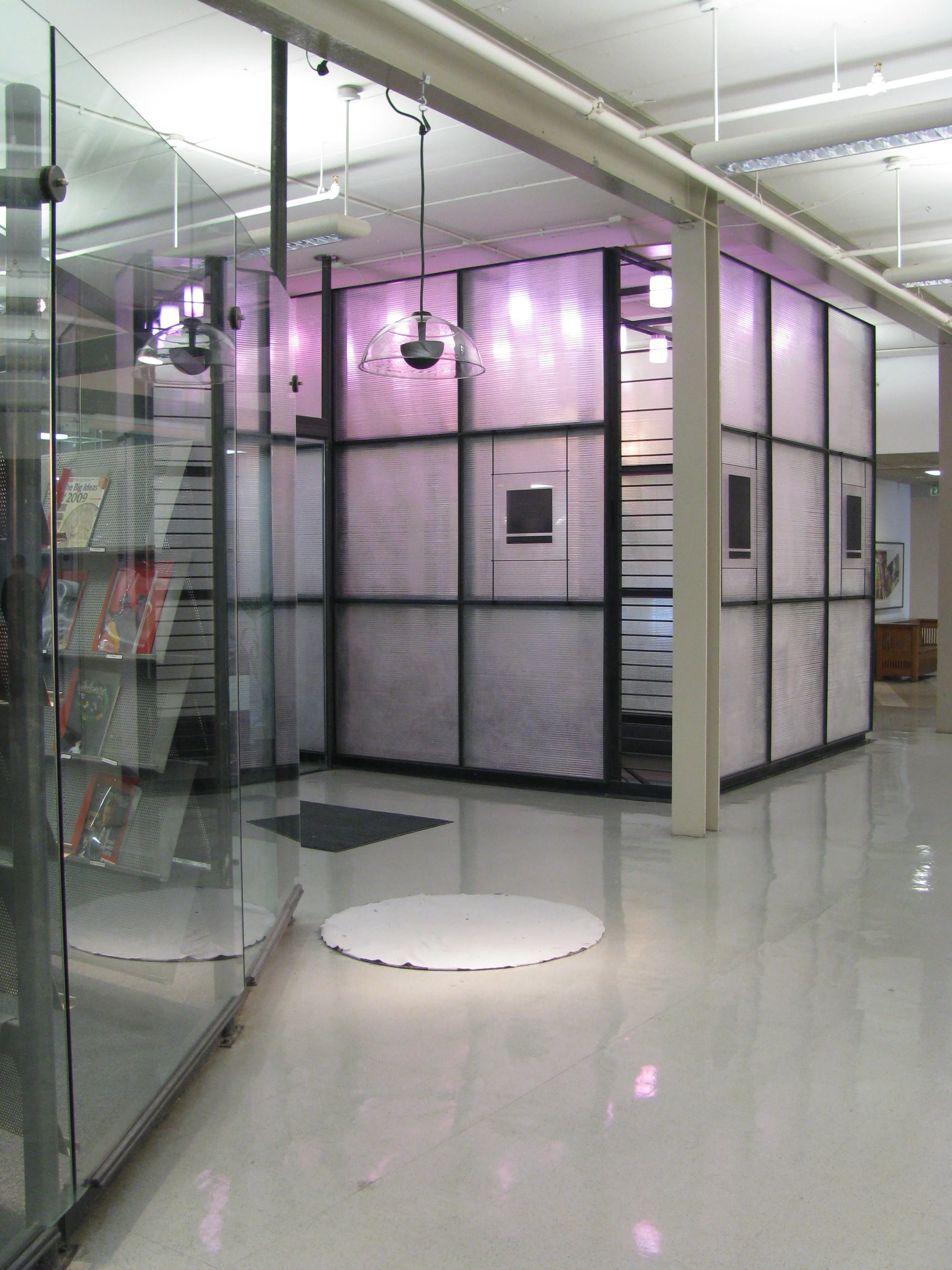 Sound, panoramic photographs, inked acrylic panels, poetry, curated library selection, and printed gallery guide. Dimensions variable