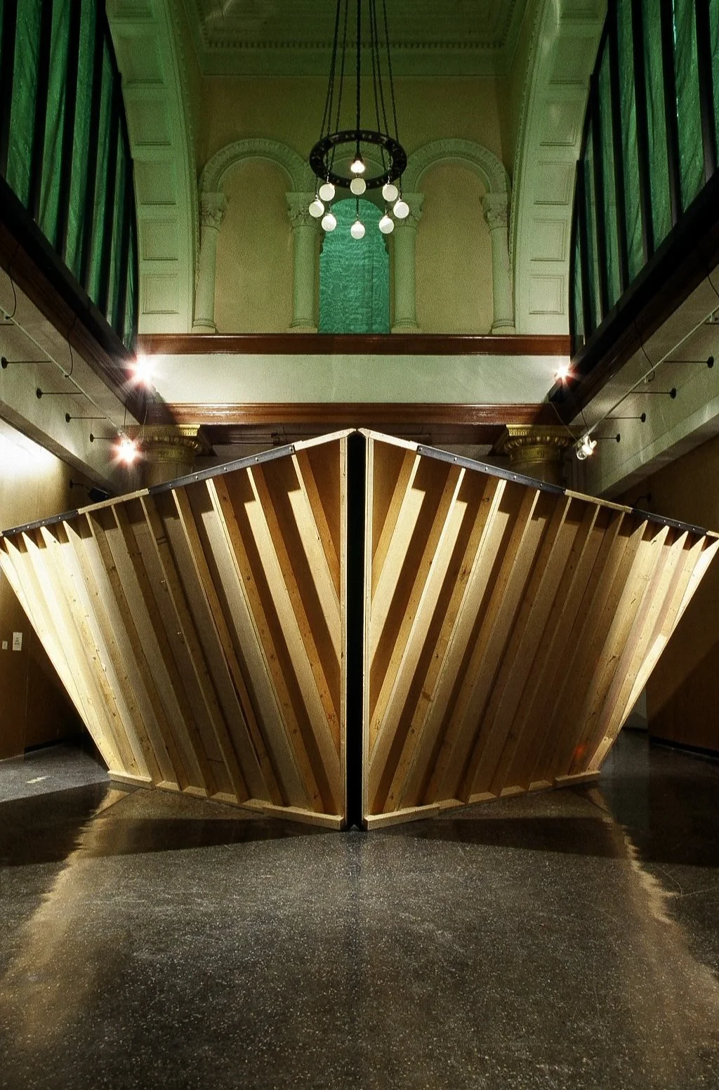 The interior of Sumus is lined with mirrored Plexiglass that reflects the walls, columns, arches, and original terrazzo floor of the building. A linear steel structure radiates off the central octagon of the train station floor. Banana peels strung on the outer steel octagon create a wreath, crown or necklace. The form is a poetic interpretation of the mechanical, electrical and hydraulic systems that make up the Corti, or inner ear. The experience is enhanced by audio that combines the breathing, arm movements, and kicking of the artist swimming.