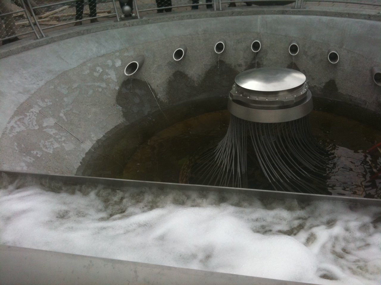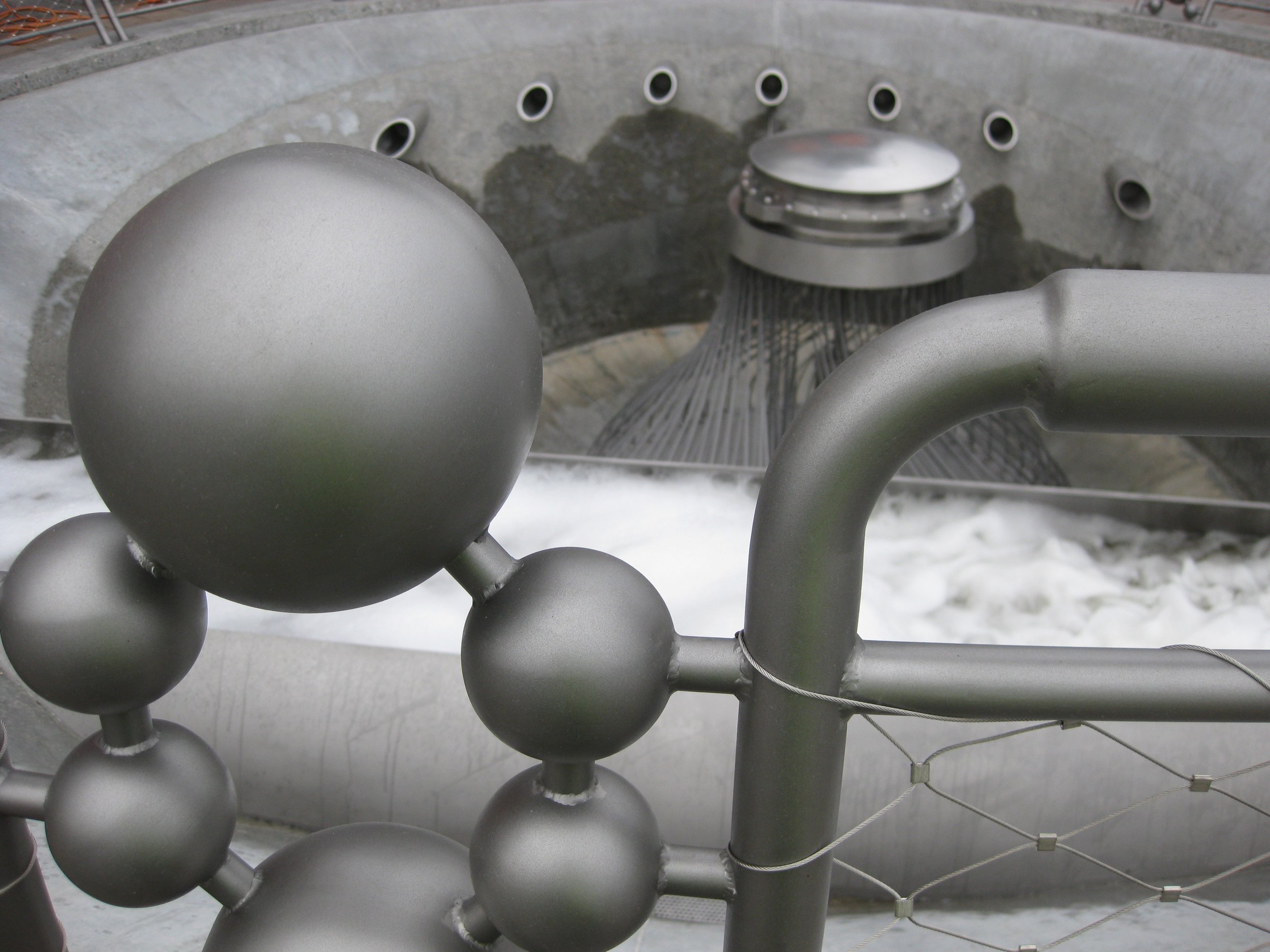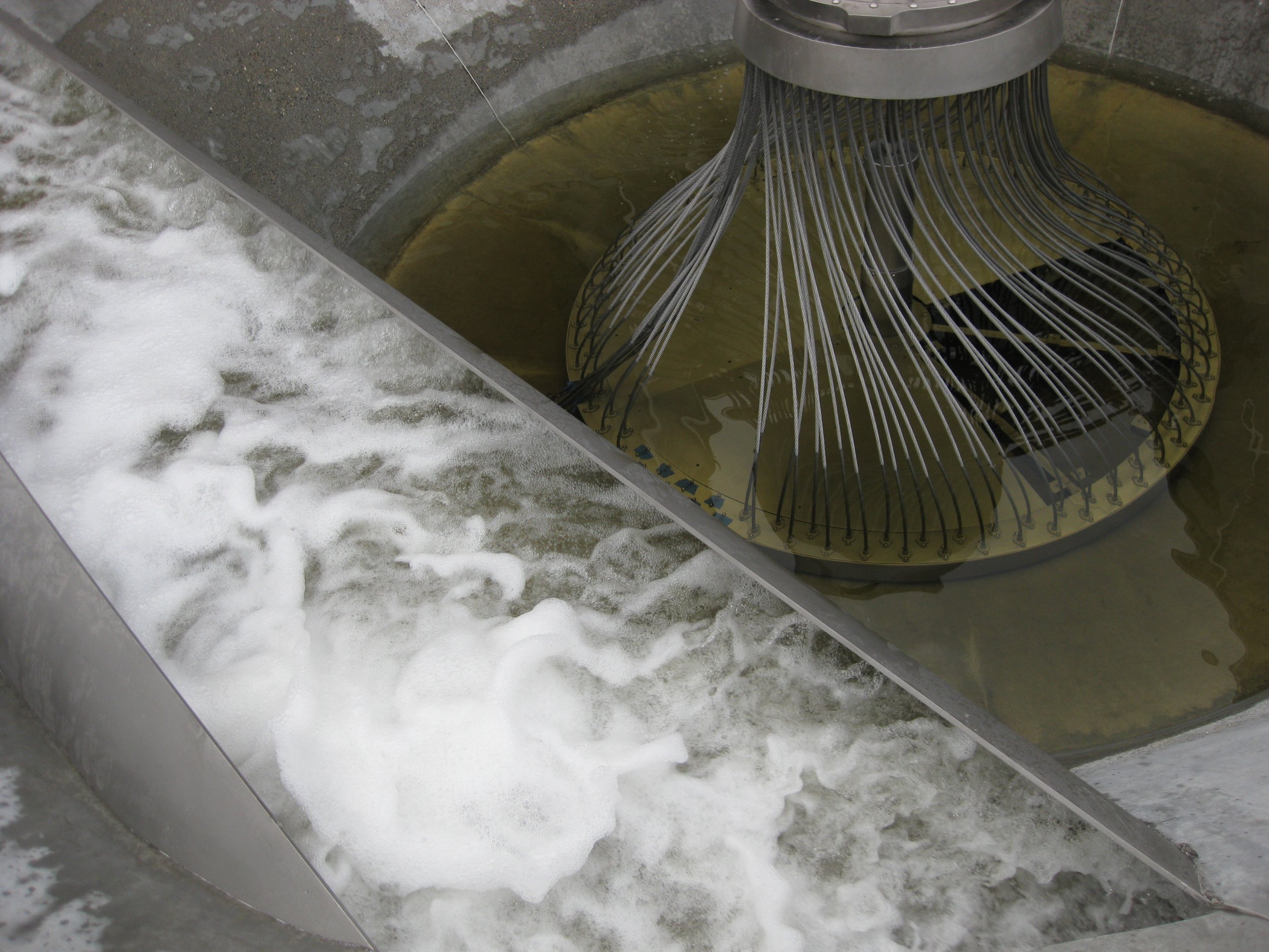 Confluence explores the inherent balance, continuity, and cycles required in the treatment of waste water. The permanent installation is sustainably designed, drawing its power from recycled electricity and air produced during the water cleansing process. Using data derived from peak periods of water flow in the wastewater system plant, the “breathing lung” or kinetic sculptural element at the center of the fountain recycles water with a smooth, human motion.