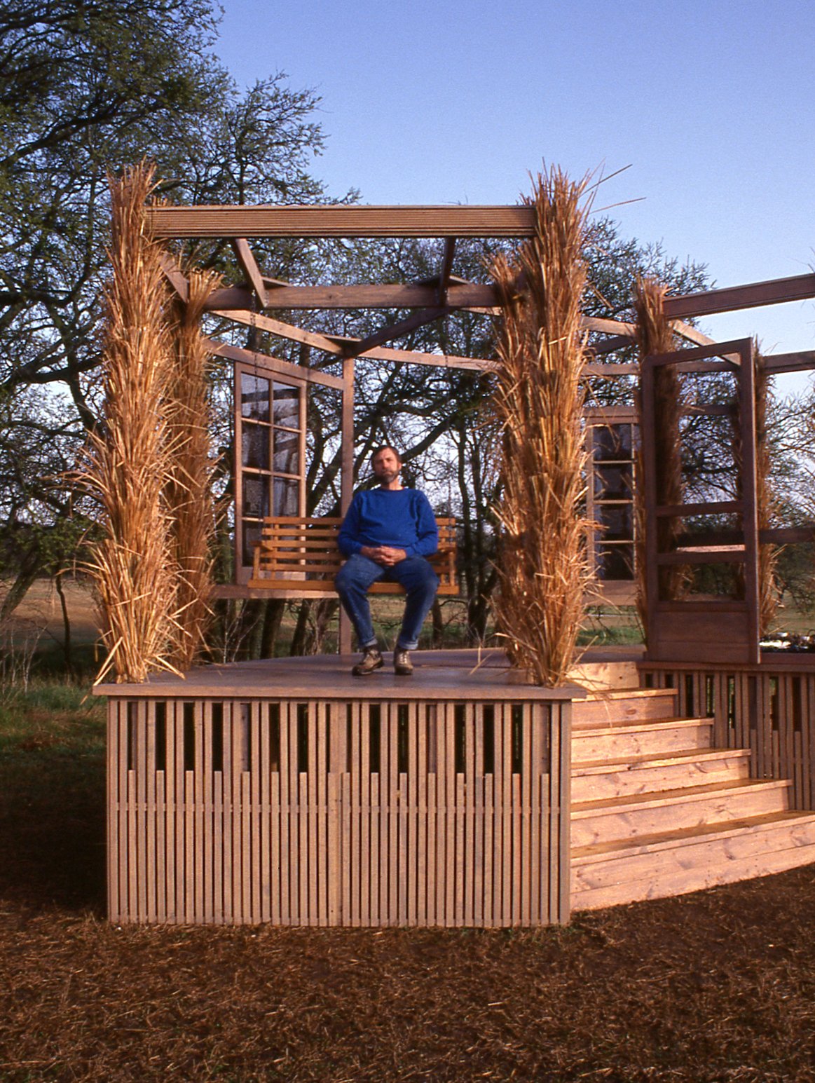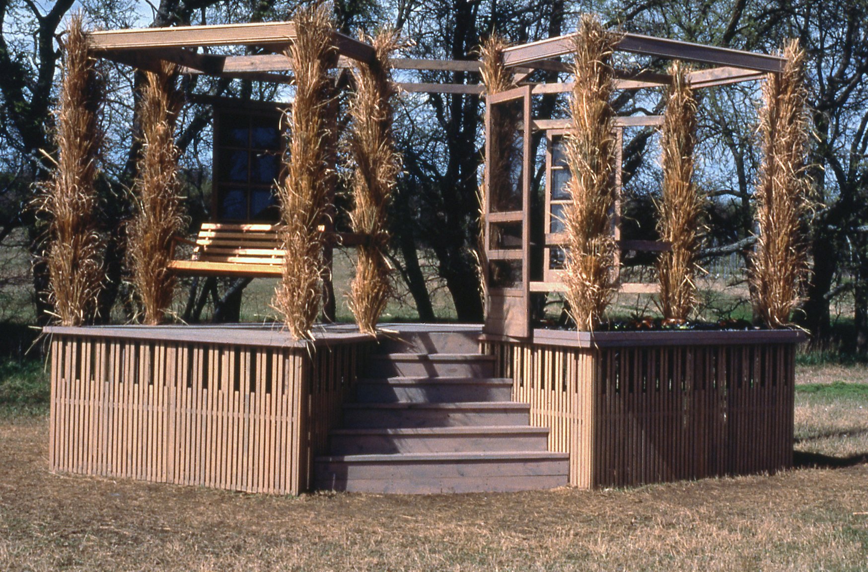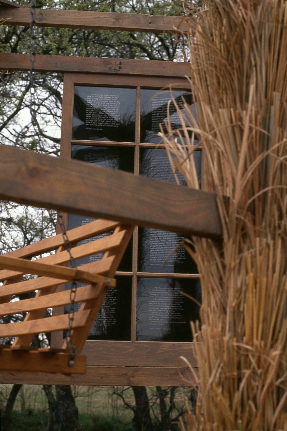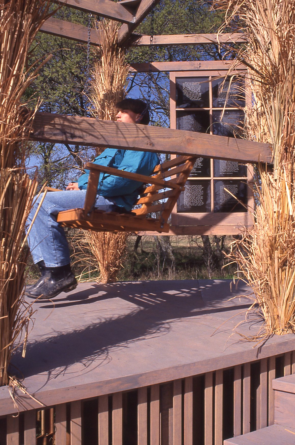 Tears and Sunshine was commissioned by the Connemara Conservancy Foundation in Plano, Texas. It is a structure that has a porch, a swing, two windows, five steps, a screen door and a parterre garden. Collectively these elements integrate into the site while creating space to contemplate the past and create new memories while reflecting upon the open Texas sky. The windows contain quotes from the diaries of women who settled northern and central Texas. The style and topic of each reflects the social, economic and political diversity of the settlers. The garden is composed of commonplace elements organized in a traditional quilt design that possesses multiple associations; such as poetic references regarding the American Wilderness as representing both the Garden of Eden and the Gates of Hell.